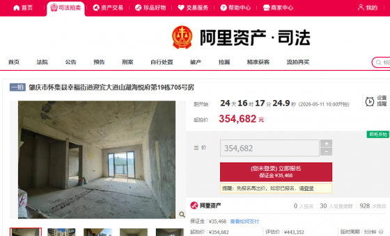 近日,阿里司法拍卖平台上架了一套怀集山湖海悦府的房源,拍卖将于5月11日上午10时